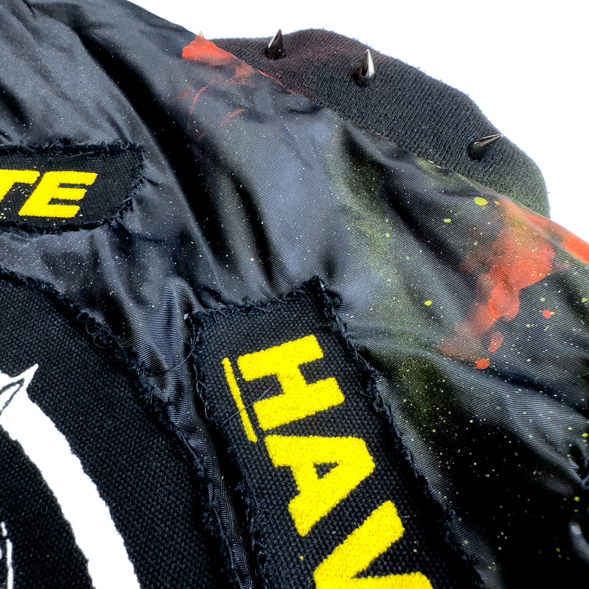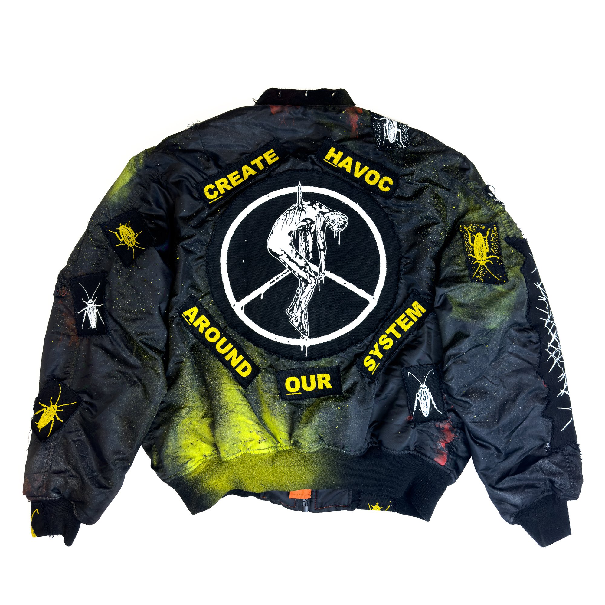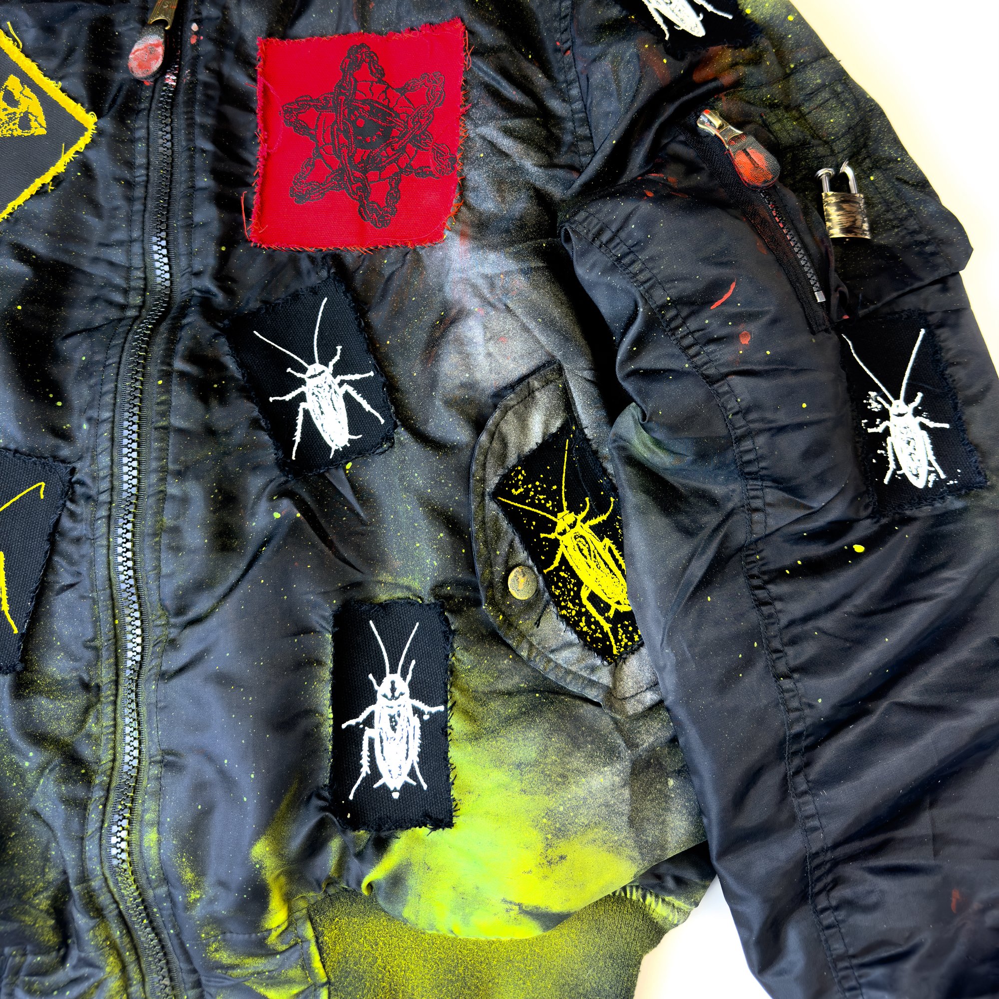 Painted, screen printed + patches sewn by hand